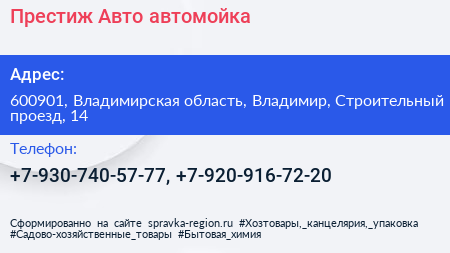 Престиж Авто, автомойка по адресу 600901, Владимирская область, Владимир, Строительный проезд, 14 в дальнейшем Организация, размещена в следующих категориях: