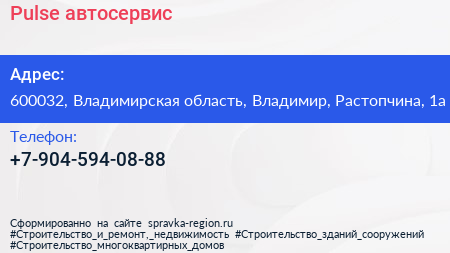 Pulse, автосервис по адресу 600032, Владимирская область, Владимир, Растопчина, 1а в дальнейшем Организация, размещена в следующих категориях: