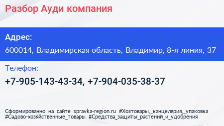Разбор Ауди, компания по адресу 600014, Владимирская область, Владимир, 8-я линия, 37 в дальнейшем Организация, размещена в следующих категориях: