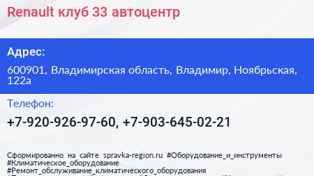 Renault-клуб 33, автоцентр по адресу 600901, Владимирская область, Владимир, Ноябрьская, 122а в дальнейшем Организация, размещена в следующих категориях: