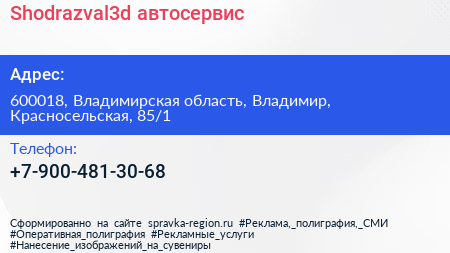 Shodrazval3d, автосервис по адресу 600018, Владимирская область, Владимир, Красносельская, 85/1 в дальнейшем Организация, размещена в следующих категориях: