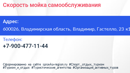 Скорость, мойка самообслуживания по адресу 600026, Владимирская область, Владимир, Гастелло, 23 к1 в дальнейшем Организация, размещена в следующих категориях: