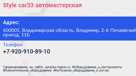 Style-car33, автомастерская по адресу 600005, Владимирская область, Владимир, 2-й Почаевский проезд, 11Б в дальнейшем Организация, размещена в следующих категориях: