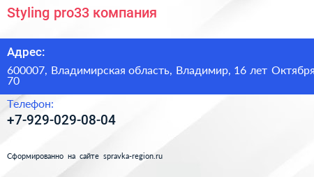 Styling pro33, компания по адресу 600007, Владимирская область, Владимир, 16 лет Октября, 70 в дальнейшем Организация, размещена в следующих категориях: