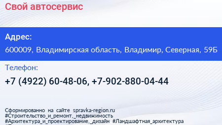 Свой, автосервис по адресу 600009, Владимирская область, Владимир, Северная, 59Б в дальнейшем Организация, размещена в следующих категориях: