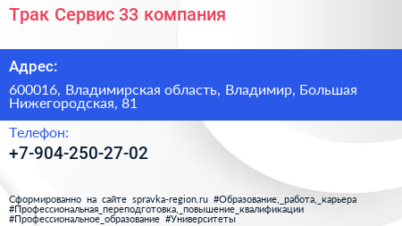 Трак Сервис 33, компания по адресу 600016, Владимирская область, Владимир, Большая Нижегородская, 81 в дальнейшем Организация, размещена в следующих категориях: