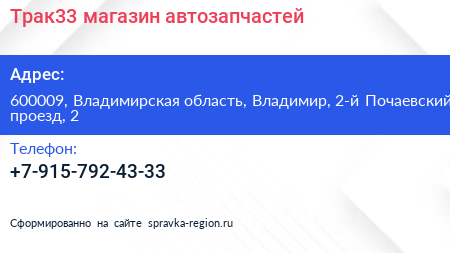 Трак33, магазин автозапчастей по адресу 600009, Владимирская область, Владимир, 2-й Почаевский проезд, 2 в дальнейшем Организация, размещена в следующих категориях: