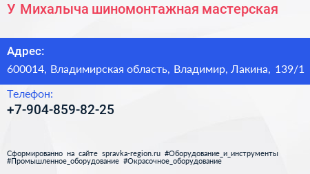 У Михалыча, шиномонтажная мастерская по адресу 600014, Владимирская область, Владимир, Лакина, 139/1 в дальнейшем Организация, размещена в следующих категориях:
