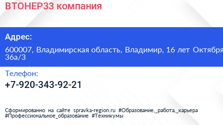 ВТОНЕР33, компания по адресу 600007, Владимирская область, Владимир, 16 лет Октября, 36а/3 в дальнейшем Организация, размещена в следующих категориях: