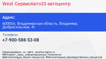 West СервисАвто33, автоцентр по адресу 600016, Владимирская область, Владимир, Добросельская, 4г в дальнейшем Организация, размещена в следующих категориях: