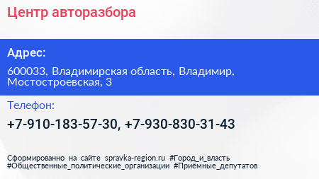 Центр авторазбора по адресу 600033, Владимирская область, Владимир, Мостостроевская, 3 в дальнейшем Организация, размещена в следующих категориях: