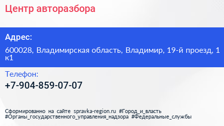 Центр авторазбора по адресу 600028, Владимирская область, Владимир, 19-й проезд, 1 к1 в дальнейшем Организация, размещена в следующих категориях: