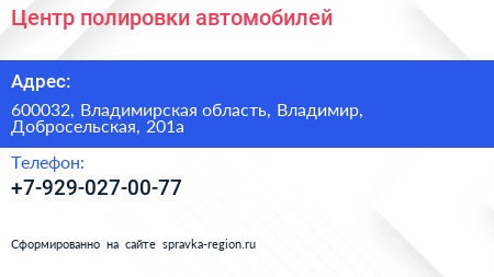 Центр полировки автомобилей по адресу 600032, Владимирская область, Владимир, Добросельская, 201а в дальнейшем Организация, размещена в следующих категориях: