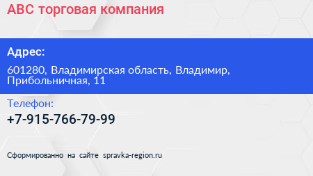 АВС, торговая компания по адресу 601280, Владимирская область, Владимир, Прибольничная, 11 в дальнейшем Организация, размещена в следующих категориях: