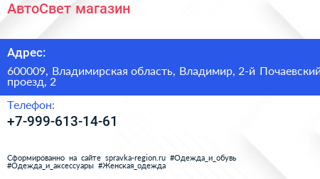 АвтоСвет, магазин по адресу 600009, Владимирская область, Владимир, 2-й Почаевский проезд, 2 в дальнейшем Организация, размещена в следующих категориях: