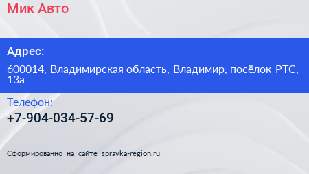 Мик Авто по адресу 600014, Владимирская область, Владимир, посёлок РТС, 13а в дальнейшем Организация, размещена в следующих категориях: