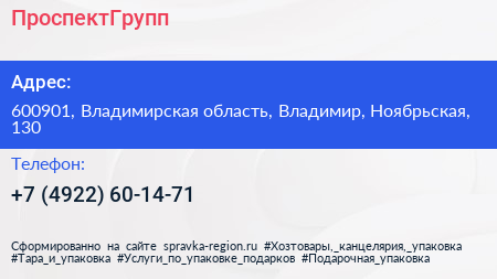 ПроспектГрупп по адресу 600901, Владимирская область, Владимир, Ноябрьская, 130 в дальнейшем Организация, размещена в следующих категориях: