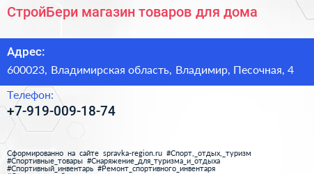 СтройБери, магазин товаров для дома по адресу 600023, Владимирская область, Владимир, Песочная, 4 в дальнейшем Организация, размещена в следующих категориях: