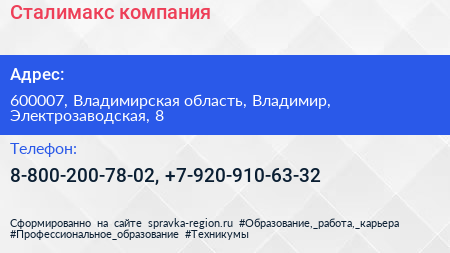 Сталимакс, компания по адресу 600007, Владимирская область, Владимир, Электрозаводская, 8 в дальнейшем Организация, размещена в следующих категориях: