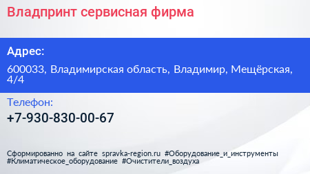 Владпринт, сервисная фирма по адресу 600033, Владимирская область, Владимир, Мещёрская, 4/4 в дальнейшем Организация, размещена в следующих категориях: