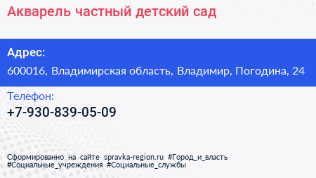 Акварель, частный детский сад по адресу 600016, Владимирская область, Владимир, Погодина, 24 в дальнейшем Организация, размещена в следующих категориях:
