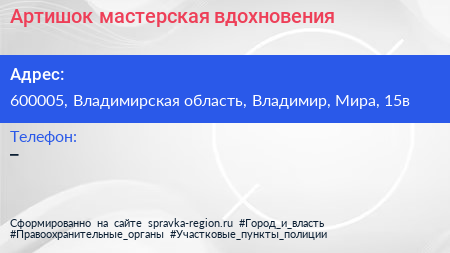 Артишок, мастерская вдохновения по адресу 600005, Владимирская область, Владимир, Мира, 15в в дальнейшем Организация, размещена в следующих категориях: