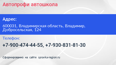 Автопрофи, автошкола по адресу 600031, Владимирская область, Владимир, Добросельская, 124 в дальнейшем Организация, размещена в следующих категориях: