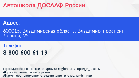 Автошкола, ДОСААФ России по адресу 600015, Владимирская область, Владимир, проспект Ленина, 25 в дальнейшем Организация, размещена в следующих категориях: