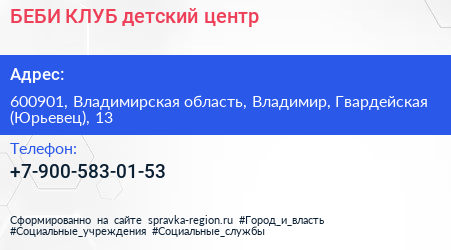 БЕБИ-КЛУБ, детский центр по адресу 600901, Владимирская область, Владимир, Гвардейская (Юрьевец), 13 в дальнейшем Организация, размещена в следующих категориях: