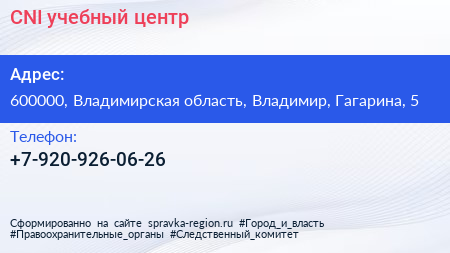 CNI, учебный центр по адресу 600000, Владимирская область, Владимир, Гагарина, 5 в дальнейшем Организация, размещена в следующих категориях: