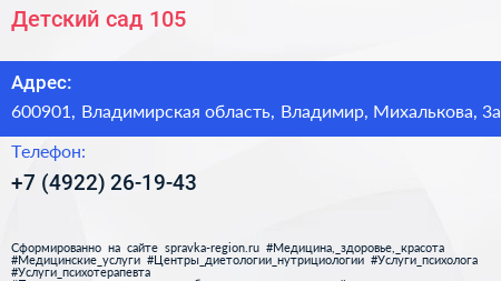Детский сад №105 по адресу 600901, Владимирская область, Владимир, Михалькова, 3а в дальнейшем Организация, размещена в следующих категориях: