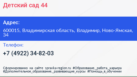 Детский сад №44 по адресу 600015, Владимирская область, Владимир, Ново-Ямская, 34 в дальнейшем Организация, размещена в следующих категориях: