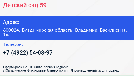 Детский сад №59 по адресу 600024, Владимирская область, Владимир, Василисина, 16а в дальнейшем Организация, размещена в следующих категориях: