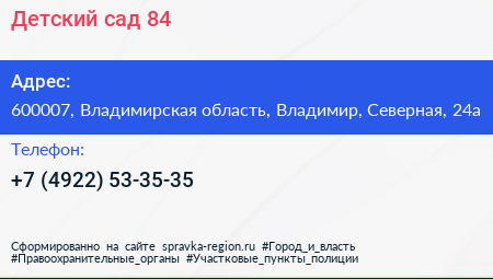 Детский сад №84 по адресу 600007, Владимирская область, Владимир, Северная, 24а в дальнейшем Организация, размещена в следующих категориях:
