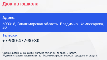 Дюк, автошкола по адресу 600018, Владимирская область, Владимир, Комиссарова, 20 в дальнейшем Организация, размещена в следующих категориях: