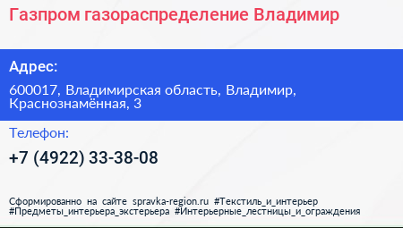 Газпром газораспределение Владимир по адресу 600017, Владимирская область, Владимир, Краснознамённая, 3 в дальнейшем Организация, размещена в следующих категориях:
