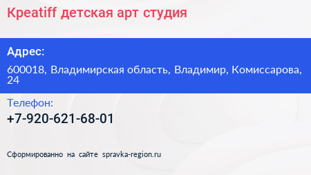 Креаtiff, детская арт-студия по адресу 600018, Владимирская область, Владимир, Комиссарова, 24 в дальнейшем Организация, размещена в следующих категориях: