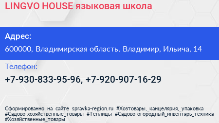 LINGVO HOUSE, языковая школа по адресу 600000, Владимирская область, Владимир, Ильича, 14 в дальнейшем Организация, размещена в следующих категориях: