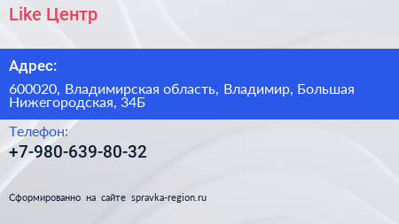 Like Центр по адресу 600020, Владимирская область, Владимир, Большая Нижегородская, 34Б в дальнейшем Организация, размещена в следующих категориях: