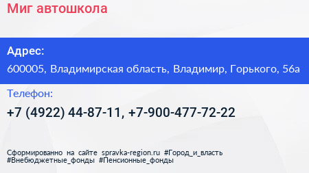 Миг, автошкола по адресу 600005, Владимирская область, Владимир, Горького, 56а в дальнейшем Организация, размещена в следующих категориях: