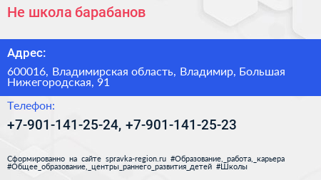 Не школа барабанов по адресу 600016, Владимирская область, Владимир, Большая Нижегородская, 91 в дальнейшем Организация, размещена в следующих категориях: