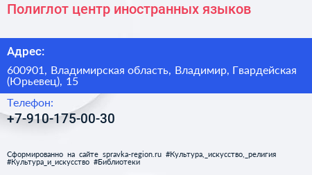 Полиглот, центр иностранных языков по адресу 600901, Владимирская область, Владимир, Гвардейская (Юрьевец), 15 в дальнейшем Организация, размещена в следующих категориях: