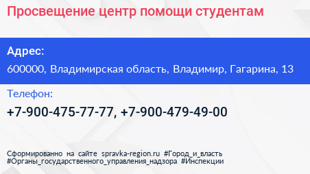 Просвещение, центр помощи студентам по адресу 600000, Владимирская область, Владимир, Гагарина, 13 в дальнейшем Организация, размещена в следующих категориях: