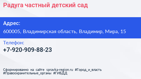 Радуга, частный детский сад по адресу 600005, Владимирская область, Владимир, Мира, 15 в дальнейшем Организация, размещена в следующих категориях: