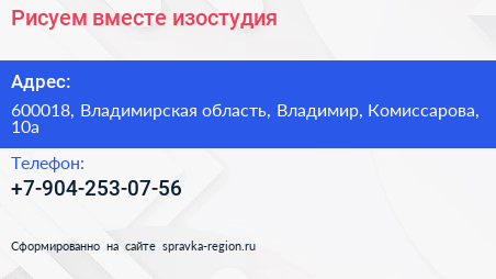 Рисуем вместе, изостудия по адресу 600018, Владимирская область, Владимир, Комиссарова, 10а в дальнейшем Организация, размещена в следующих категориях: