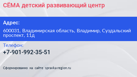 СЁМА, детский развивающий центр по адресу 600031, Владимирская область, Владимир, Суздальский проспект, 11д в дальнейшем Организация, размещена в следующих категориях: