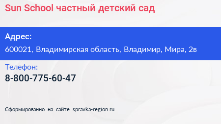 Sun School, частный детский сад по адресу 600021, Владимирская область, Владимир, Мира, 2в в дальнейшем Организация, размещена в следующих категориях:
