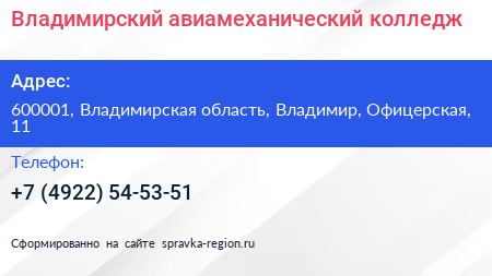 Владимирский авиамеханический колледж по адресу 600001, Владимирская область, Владимир, Офицерская, 11 в дальнейшем Организация, размещена в следующих категориях: