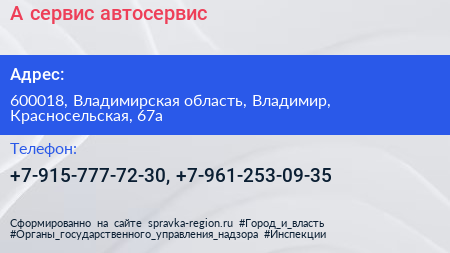 А-сервис, автосервис по адресу 600018, Владимирская область, Владимир, Красносельская, 67а в дальнейшем Организация, размещена в следующих категориях: