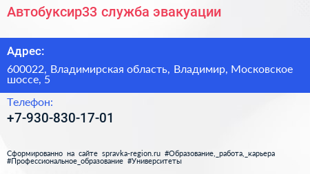 Автобуксир33, служба эвакуации по адресу 600022, Владимирская область, Владимир, Московское шоссе, 5 в дальнейшем Организация, размещена в следующих категориях: